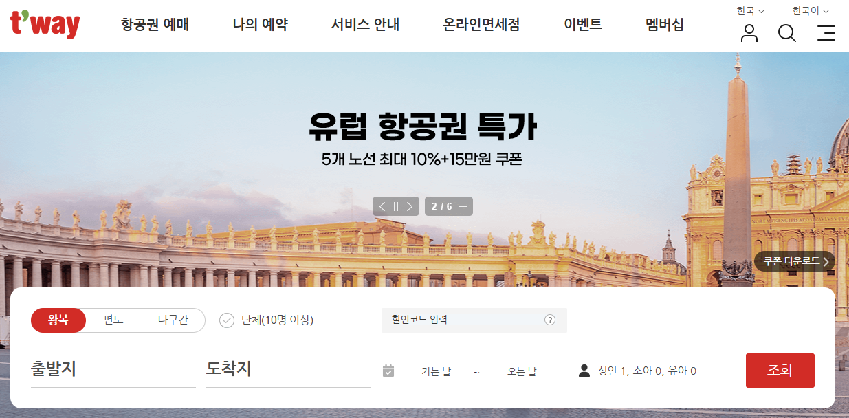 이제 티웨이항공 홈페이지를 방문해 최신 할인 항공권과 프로모션을 확인해 보세요!
