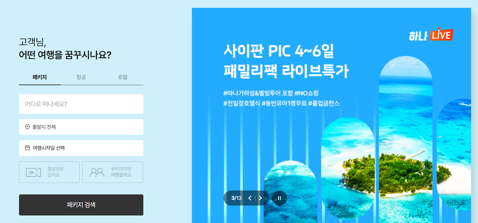 국내외 모든 여행을 위한 하나의 선택, 하나투어! 패키지여행, 자유여행, 항공권, 호텔 예약까지 한 번에 해결할 수 있는 하나투어 홈페이지에서 더 풍성한 혜택과 다양한 여행 상품을 만나보세요. 지금 바로 방문해 여행 계획을 시작해보세요! 🚀