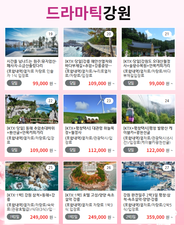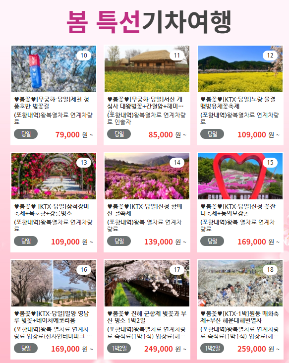 👉 정동진 해돋이 여행, 전국 명산 등산열차, 계절별 테마 여행 등이 가장 인기가 많습니다.