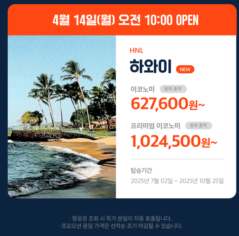 특히 하와이 호놀룰루 노선은 이번 프로모션을 통해 처음 공개된 신규 노선으로, 7월 2일부터 정기 운항을 시작합니다. 프리미엄 이코노미 기준으로 100만 원 초반, 이코노미는 75만 원대부터 시작되니 매우 합리적인 가격이에요.