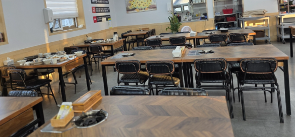 내부는 깔끔하며, 테이블 간격이 적당하여 편안하게 식사할 수 있습니다.