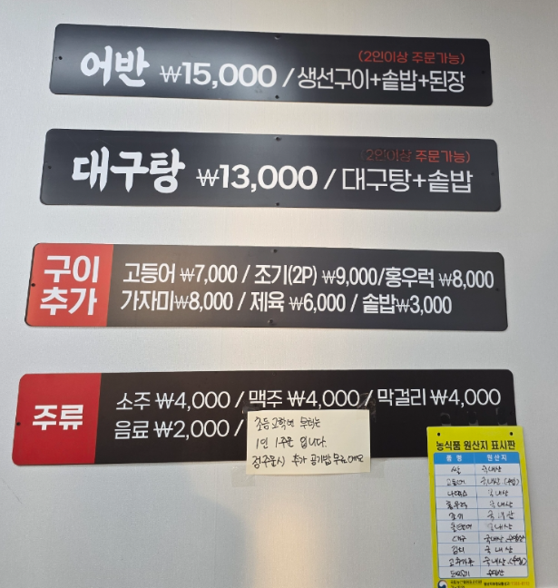 대표 메뉴: 대구탕, 생선구이, 솥밥