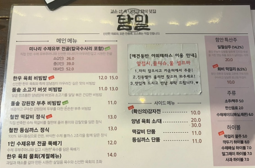함안 맛집 탐밀에서는 다양한 한식 메뉴를 제공합니다. 그중에서도 베스트 메뉴는 다음과 같습니다: