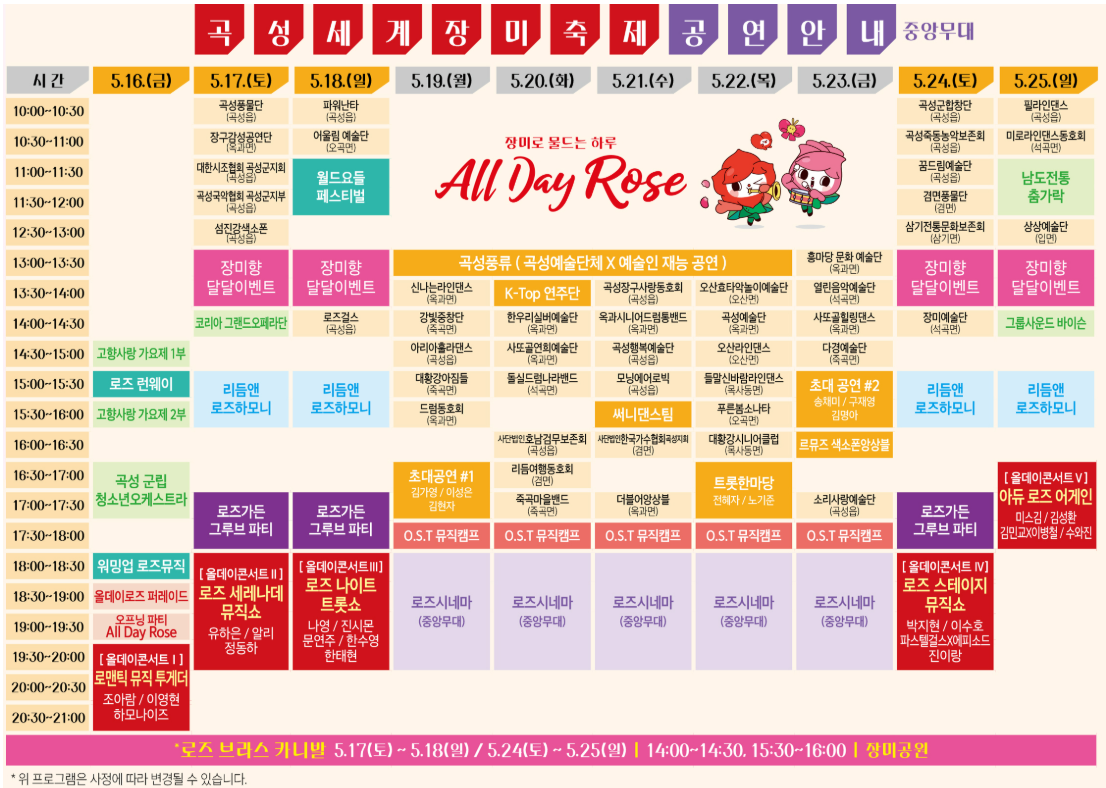 올해의 하이라이트! 곡성 세계장미축제 올데이콘서트에서는 국내 최정상급 아티스트들이 매일 무대를 빛냅니다. 일정별 라인업은 다음과 같습니다: