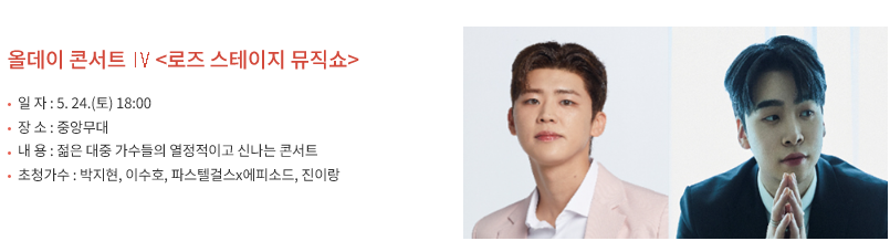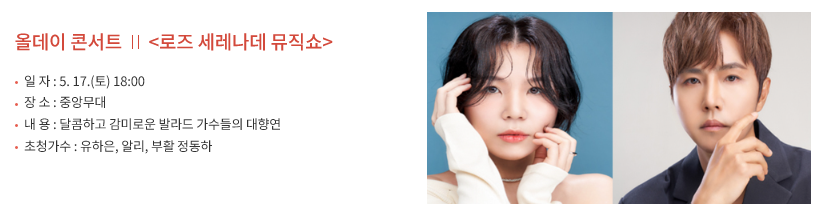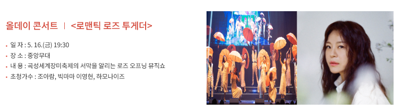 | 5월 17일 (토) | 알리, 정동하 | 로맨틱 로즈 콘서트 |
