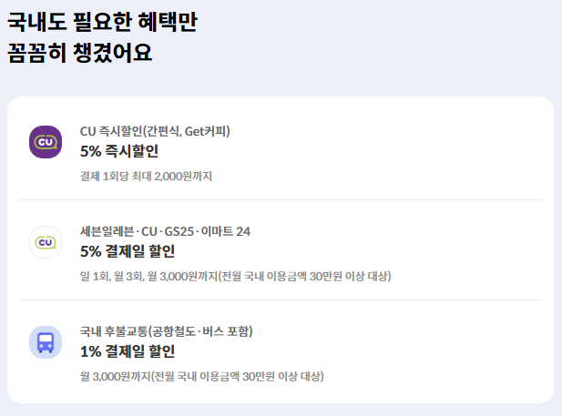- 국내 대중교통 (버스, 지하철): 1% 할인