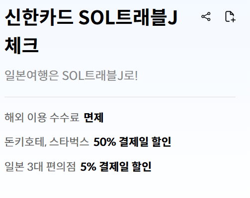 신한카드 SOL트래블J 체크카드는 일본 여행에서 특히 빛을 발합니다. 해외 쇼핑부터 현지 통화 결제, 국내외 편의점 할인까지 폭넓은 혜택을 제공하니 여행자, 해외 직구족, 국내외 쇼핑족 모두에게 추천드립니다. ✨