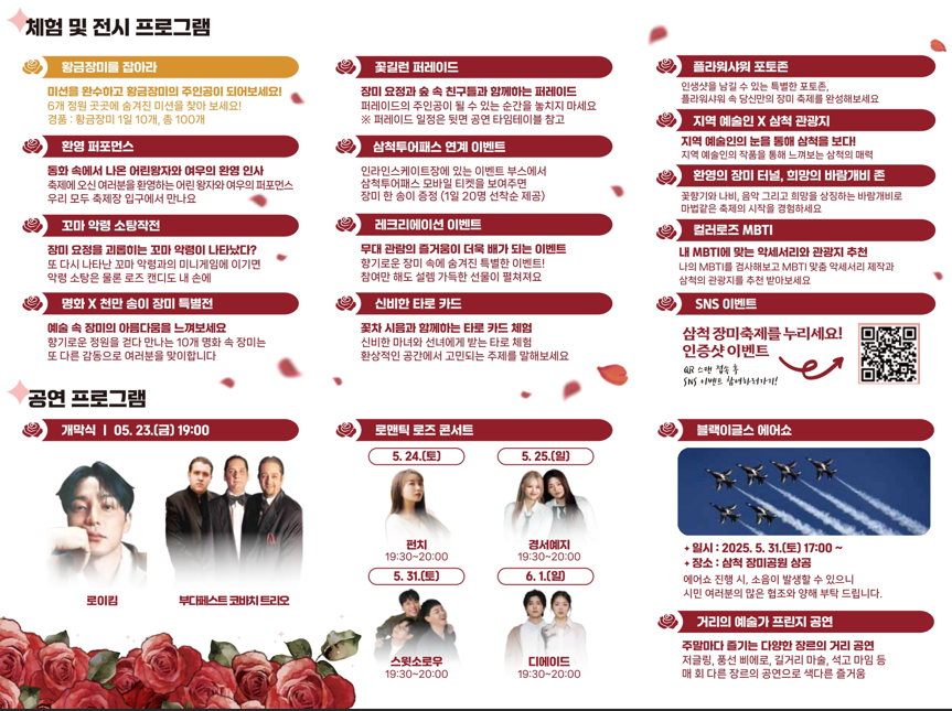 삼척 장미축제는 단순한 꽃 축제를 넘어, 이야기와 체험이 어우러진 특별한 경험을 제공합니다. 가족, 연인, 친구와 함께 천만 송이 장미가 피어나는 환상의 정원에서 잊지 못할 추억을 만들어보세요.