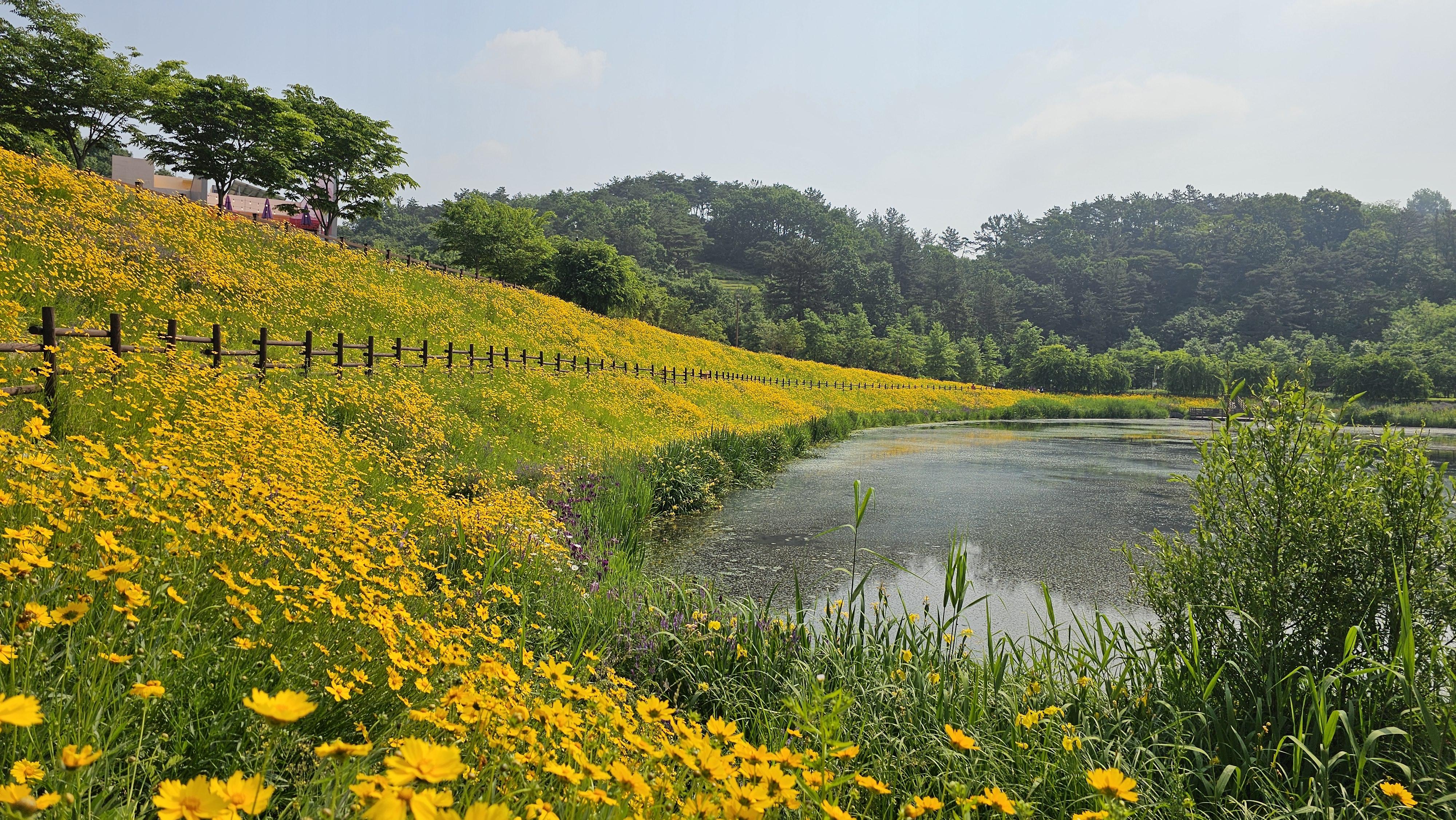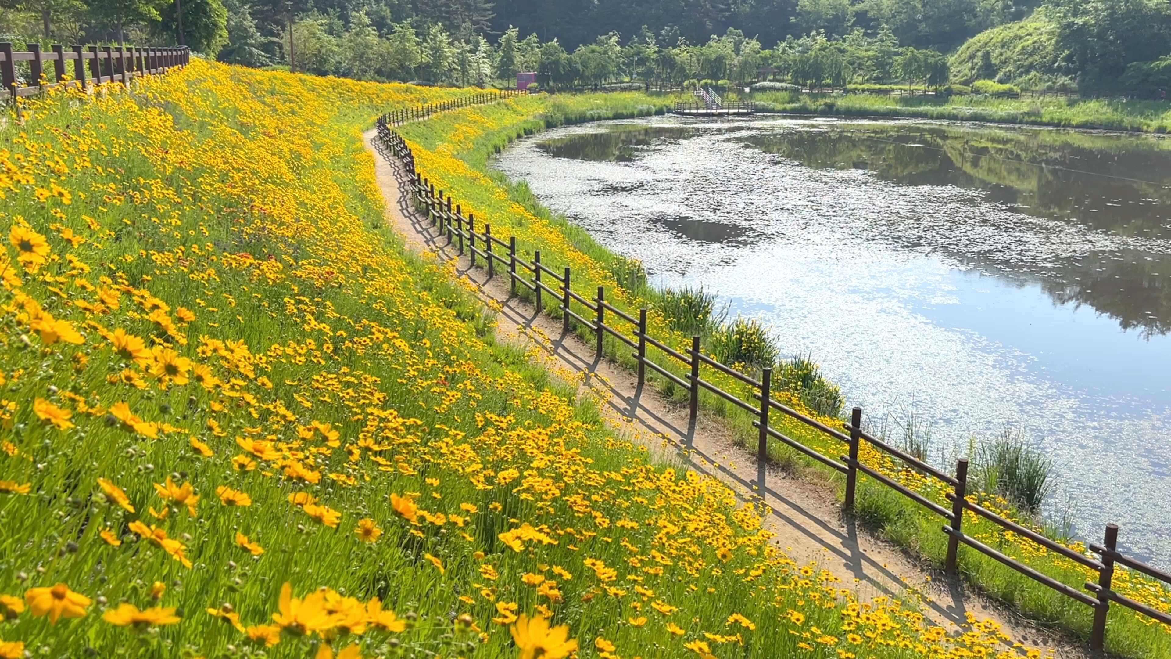 특히 5월 중순부터 6월 초까지는 금계국이 만개하여 산책로를 따라 노란 물결이 이어집니다.