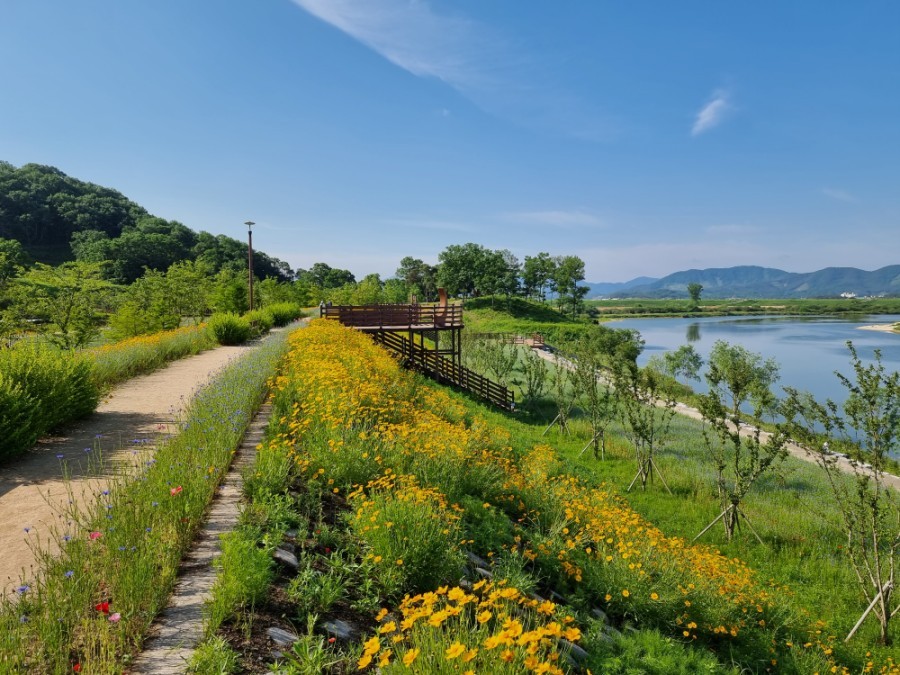 특히 금계국 사이를 걸으며 찍는 전신샷, 그리고 강을 배경으로 한 풍경샷은 SNS 업로드용으로 제격입니다.