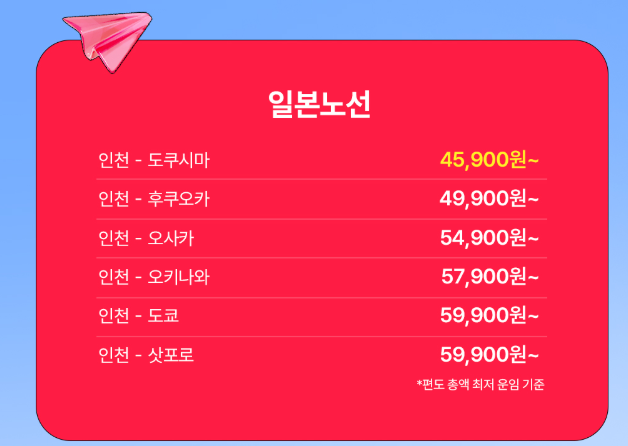 - ✈ 제주 노선: 1만 9900원부터 (15kg 무료 위탁 수하물 제공)