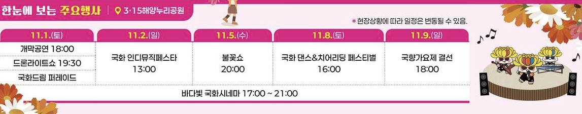 ✔️ 구성: 국화 전시, 불꽃놀이, 드론쇼, 초대가수 공연, 체험 행사 등