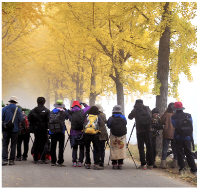 양곡 은행나무길은 단풍 자체만으로도 황홀하지만, 다양한 포토존이 준비되어 있어 특별한 사진을 남기기에 최적입니다. 특히 이른 아침, 문광저수지를 덮는 물안개와 함께 촬영하면 몽환적인 분위기를 담을 수 있습니다.
