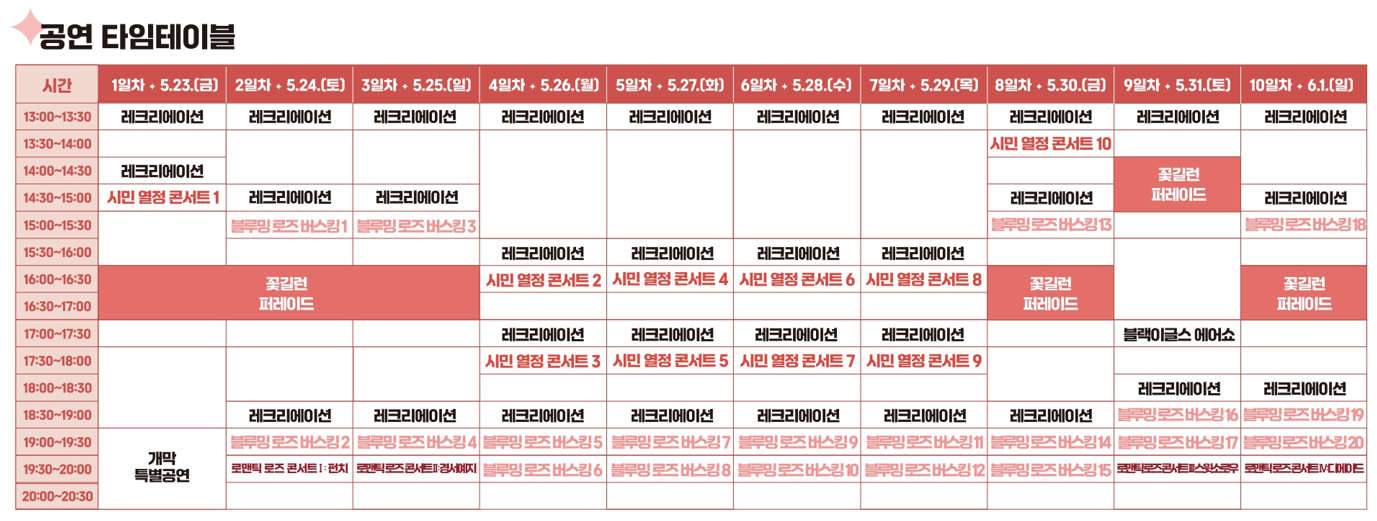 축제 기간 동안 다양한 아티스트들의 공연이 예정되어 있습니다. 5월 23일 개막식에서는 인기가수 로이킴과 부다페스트 코바스 트리오가 축하공연을 펼치며, 5월 24일에는 펀치, 5월 25일에는 경서예지, 5월 31일에는 스윗소로우, 6월 1일에는 디에이드가 무대에 올라 장미향 가득한 무대를 선사할 예정입니다. 특히, 5월 31일 오후 5시에는 대한민국 공군 특수비행팀 블랙이글스의 에어쇼가 진행되어 관람객들에게 특별한 추억을 선사할 것입니다.